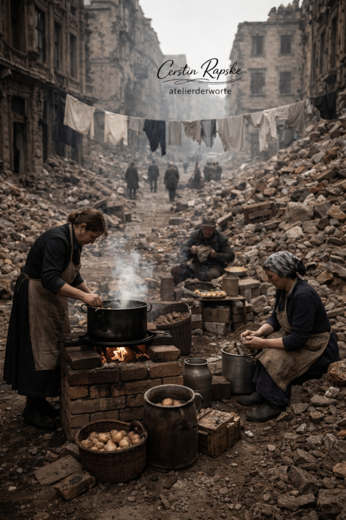 Zwischen den Trümmern wurden Feuer entzündet, Töpfe aufgestellt, Wasser geholt. Menschen taten wieder das, was Menschen immer tun mussten: Sie sorgten dafür, dass ein Tag den nächsten überstand.