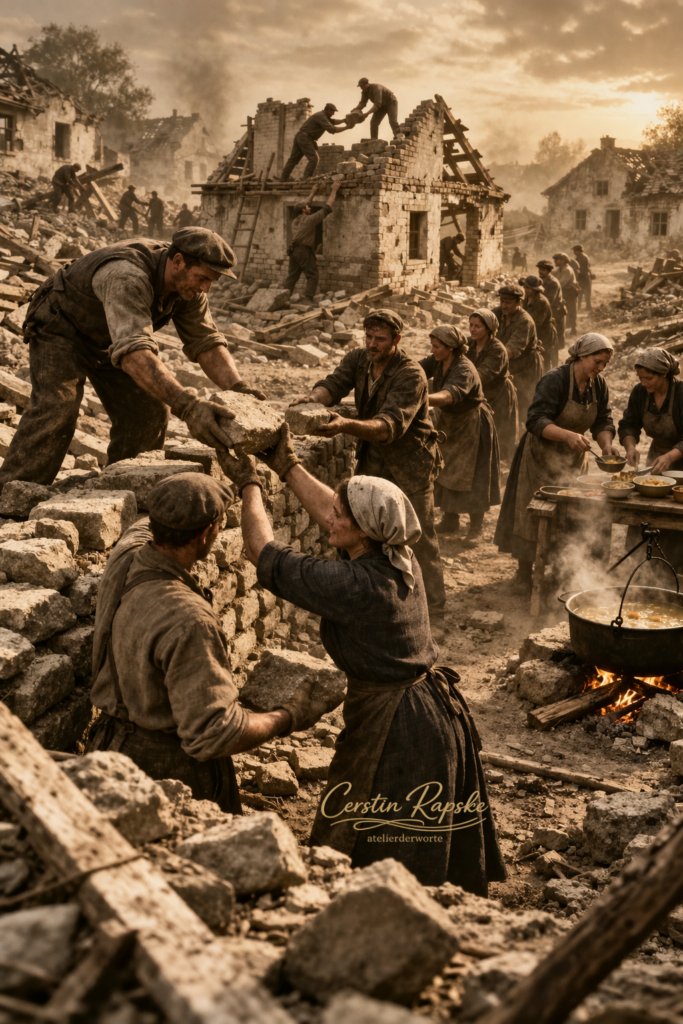 Mit Händen, die Steine anhoben, obwohl die Kraft längst aufgebraucht war. Mit Händen, die Wege freiräumten, ohne zu wissen, wohin sie führen würden. Niemand wartete auf Mut. Niemand wartete auf Zuversicht. Man tat, was getan werden musste — lange bevor sich Hoffnung zeigte.