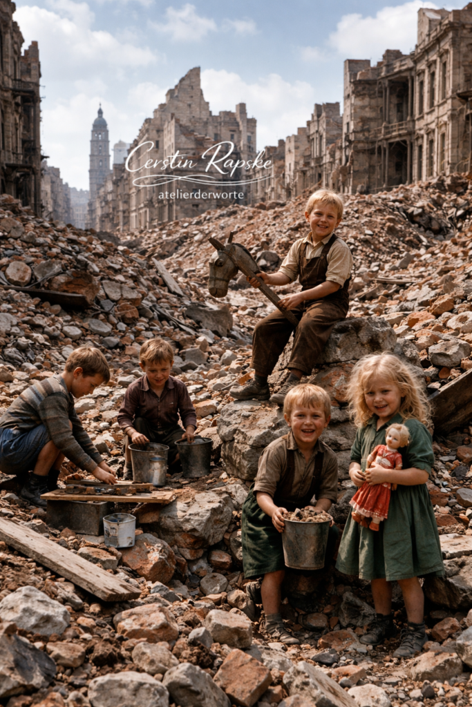Sie spielten zwischen Mauern ohne Zimmer, bauten Burgen aus Schutt und fanden Wege zu lachen, während Erwachsene schwiegen. Vielleicht verstanden sie instinktiv etwas, das wir später erst begreifen: Normalität entsteht nicht von selbst. Sie wird erschaffen — im Spiel, im Tun, im Weitermachen.